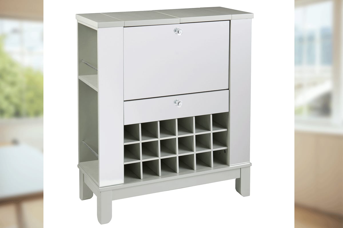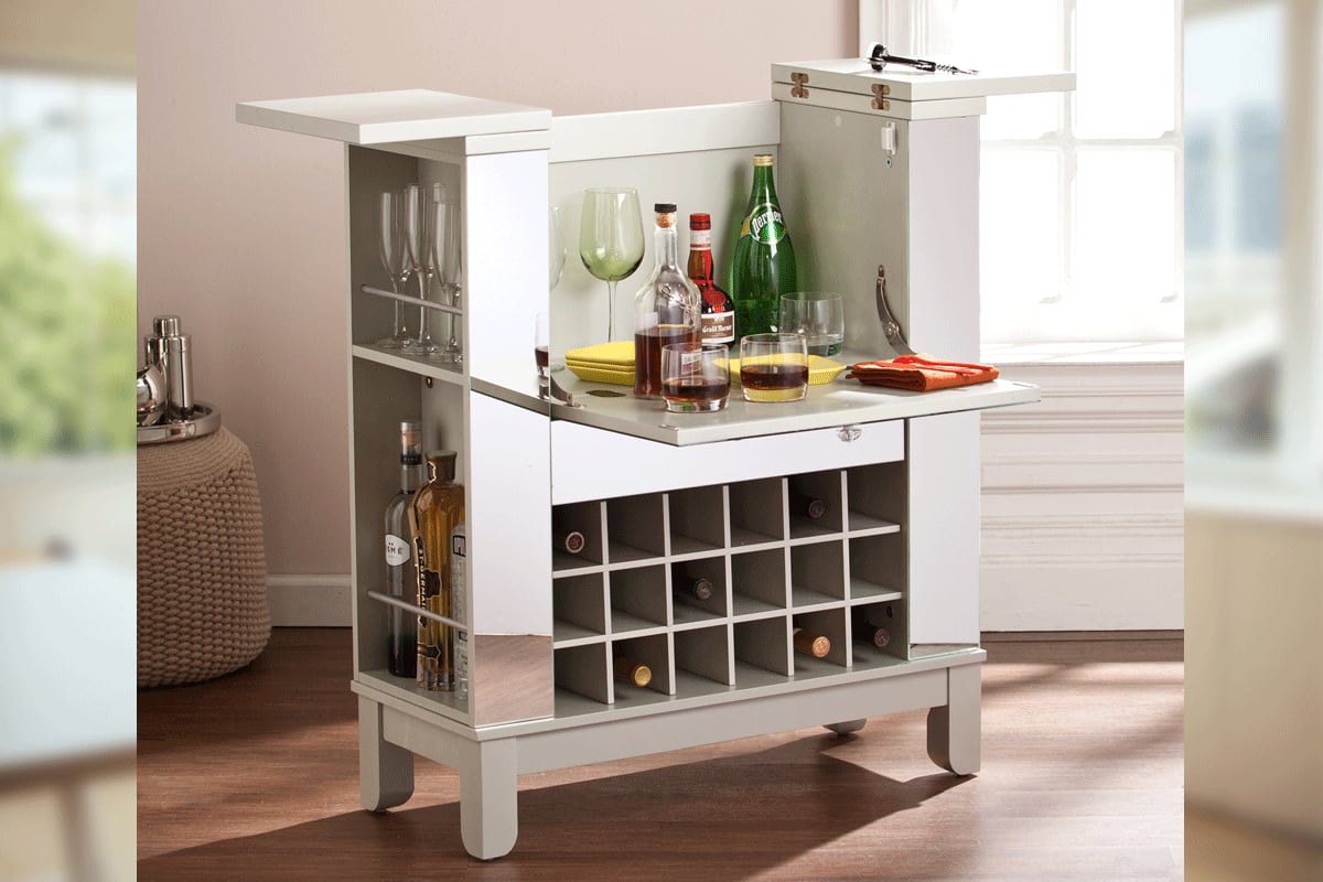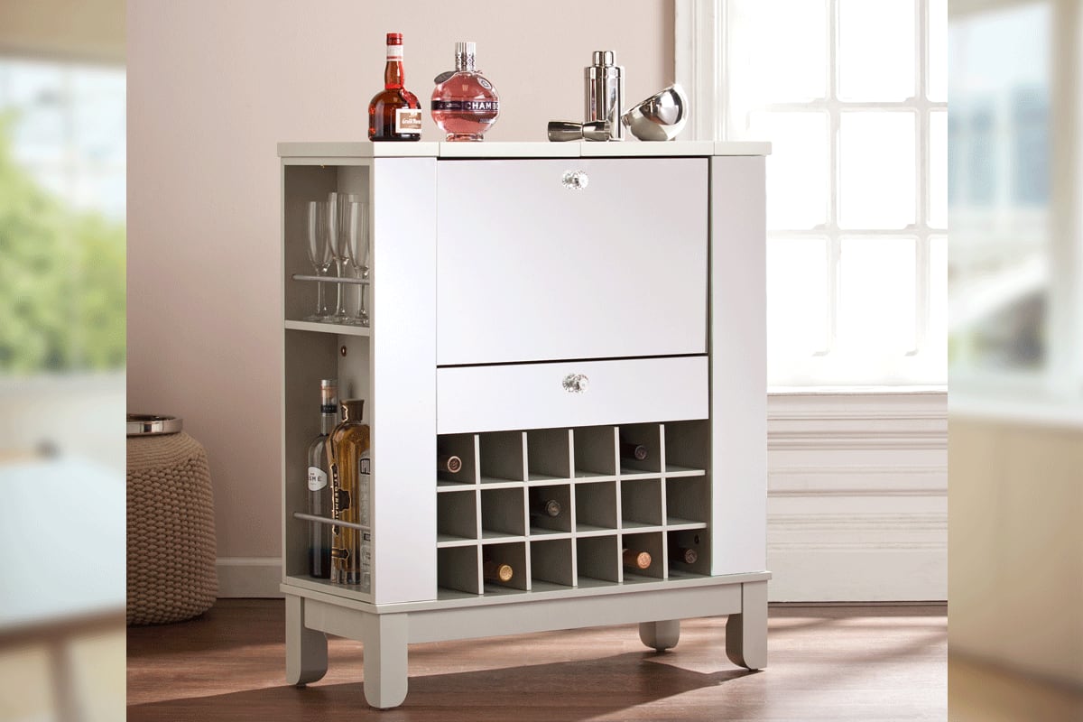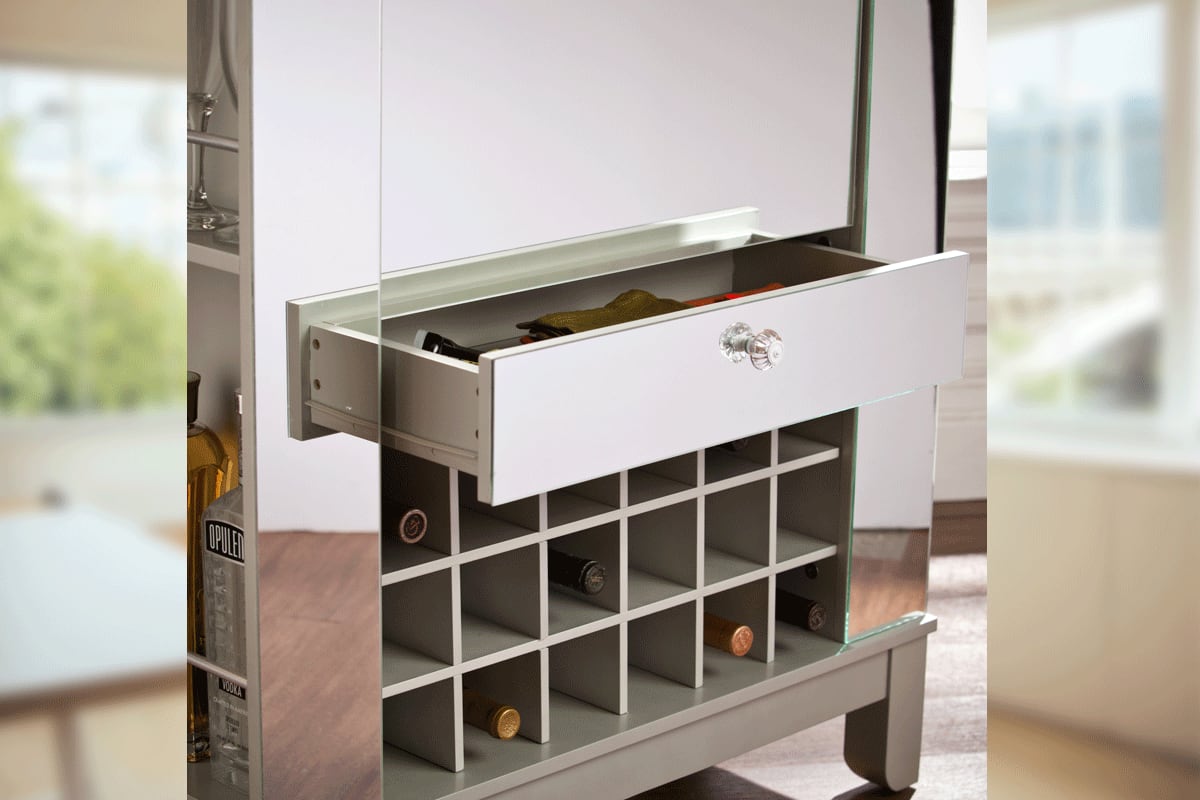 コンパクトな折りたたみ式キャビネットです。大切なワインやグラスなどが美しく収まる家庭用ワインキャビネット。折りたたみ式のコンパクトなデザインなので、場所を取らずどんなお部屋にも収まります。抜群の収納力と高いデザイン性を両立した機能的なキャビネットです。ミラードシルバー仕上げにクリスタルの取っ手がデザインされたエレガントなグラムスタイル。便利な引出し付き。折りたたみのテーブルを広げるとバーカウンターにもなり、ホームパーティーに最適です。