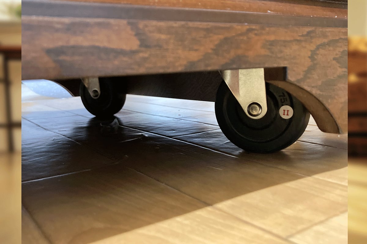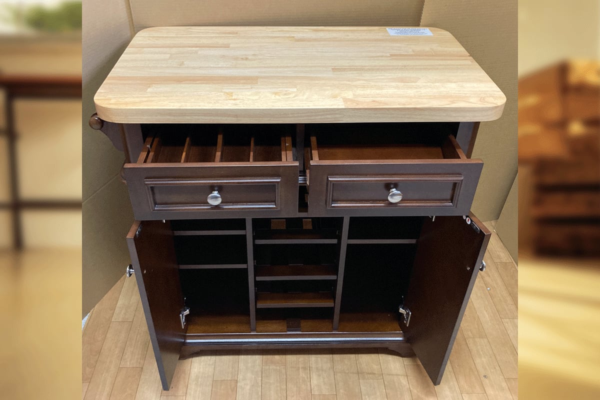 天然木の無垢天板と家具調キャビネットのキッチンアイランドです。キッチンで必要な様々なアイテムが収納できます。移動に便利なキャスター付きで中央にはオープンなボトルラックが配置してあります。カッティングボードやサイドにはタオルバーも付いています。2つの引き出しは、スライド式で両サイドからアクセス可能です。