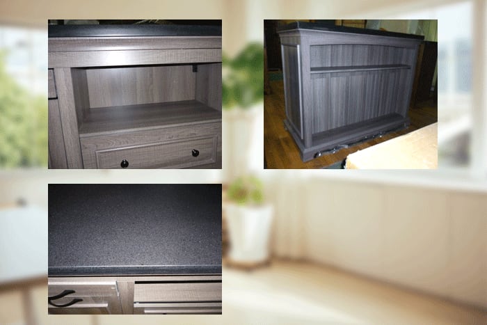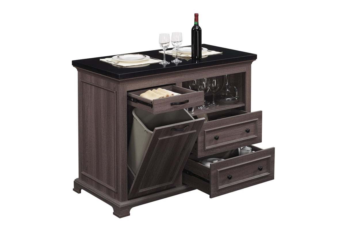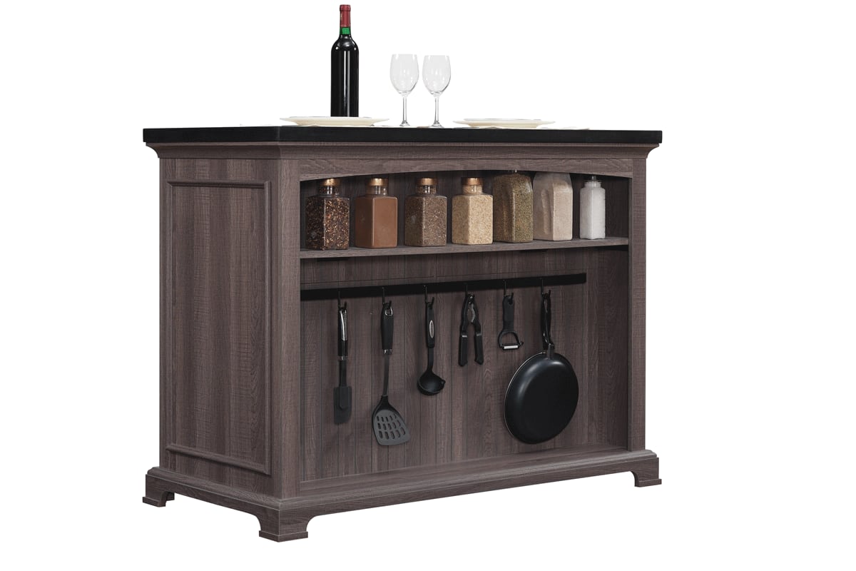 両面が収納に活用できるのが、最大の特徴です。前面には、3つの引き出しとオープン棚、手前に開く大きな収納があります。大きな収納にはゴミ箱が設置でき、オシャレなキッチンインテリアを演出します。背面にはフライパンやキッチンツールを吊るして収納が可能です。吊るし収納上部のオープン棚に調味料も収納できます。全体的に落ち着いた風合いの仕上がりとなっております。