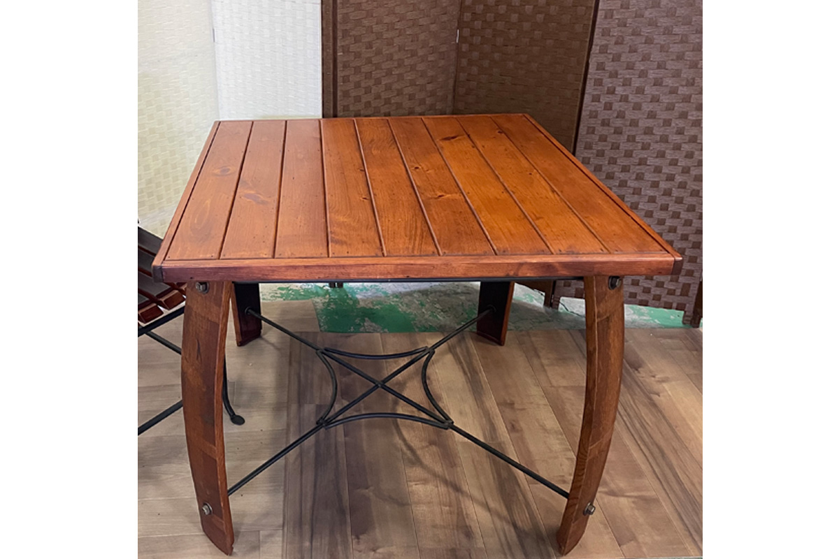 イン樽の風格を感じさせるワイン樽家具。ワイン樽家具は、カリフォルニアのワイナリーで使用されたワインの樽(オーク柾目材)を再利用した手作り家具です。樽板の厚みは1インチ(約2.54cm)と、どっしりとした安定感があります。ワイン樽の曲線を生かしたデザインと長年に渡りワインを貯蔵した色つやは、安らぎと心地良い空間を演出してくれます