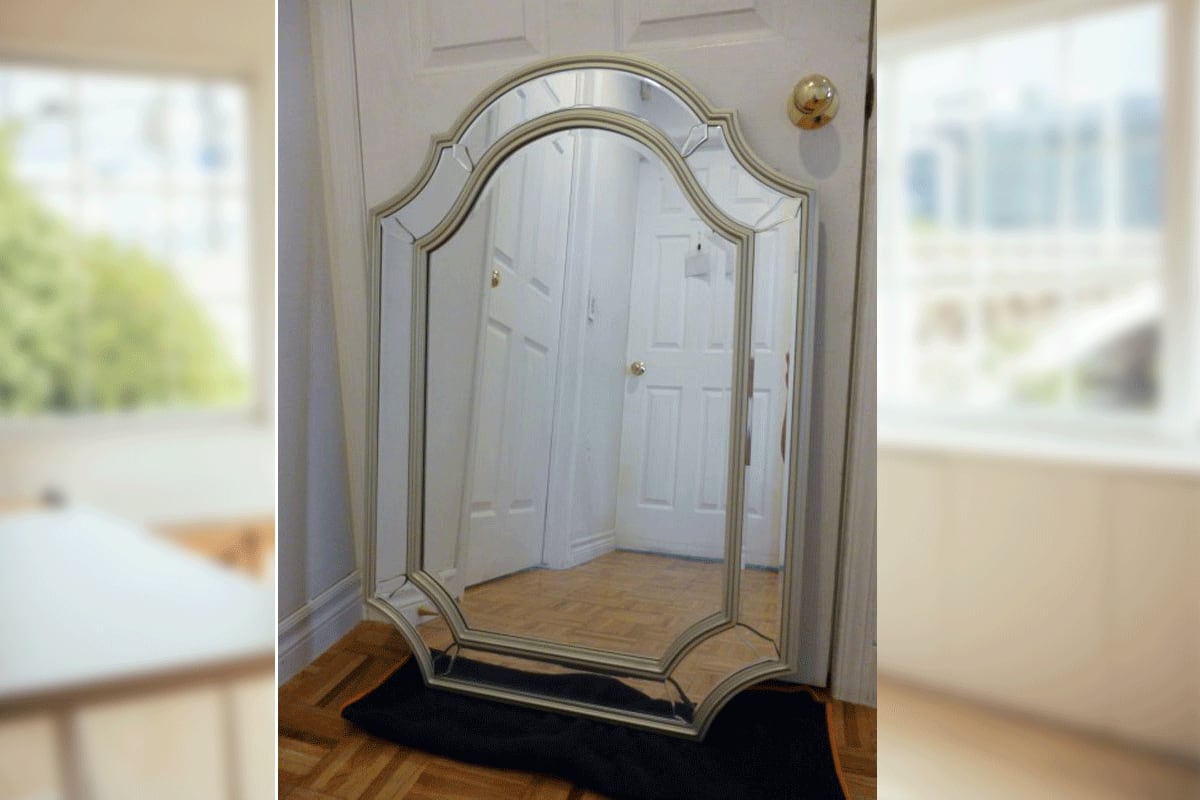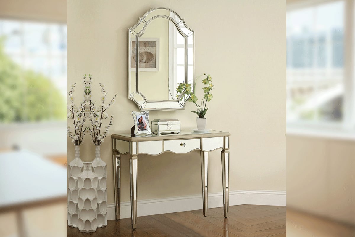 直輸入のコンソールテーブルセット。前面ミラー仕上げのスタイリッシュなデザインです。
