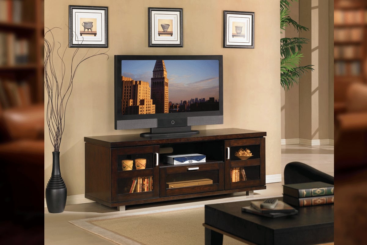 インテリア性と機能性に優れたメディアコンソール(テレビボード)です。木のフレームにはめ込まれた強化ガラスが、面取り加工が施されており安全です。棚板の高さは調節可能です。裏側には配線と換気用の穴が空いていますので、スッキリとお使い頂けます。スタイリッシュでモダンなデザインとサテンニッケル仕上げのハンドルが特徴です。