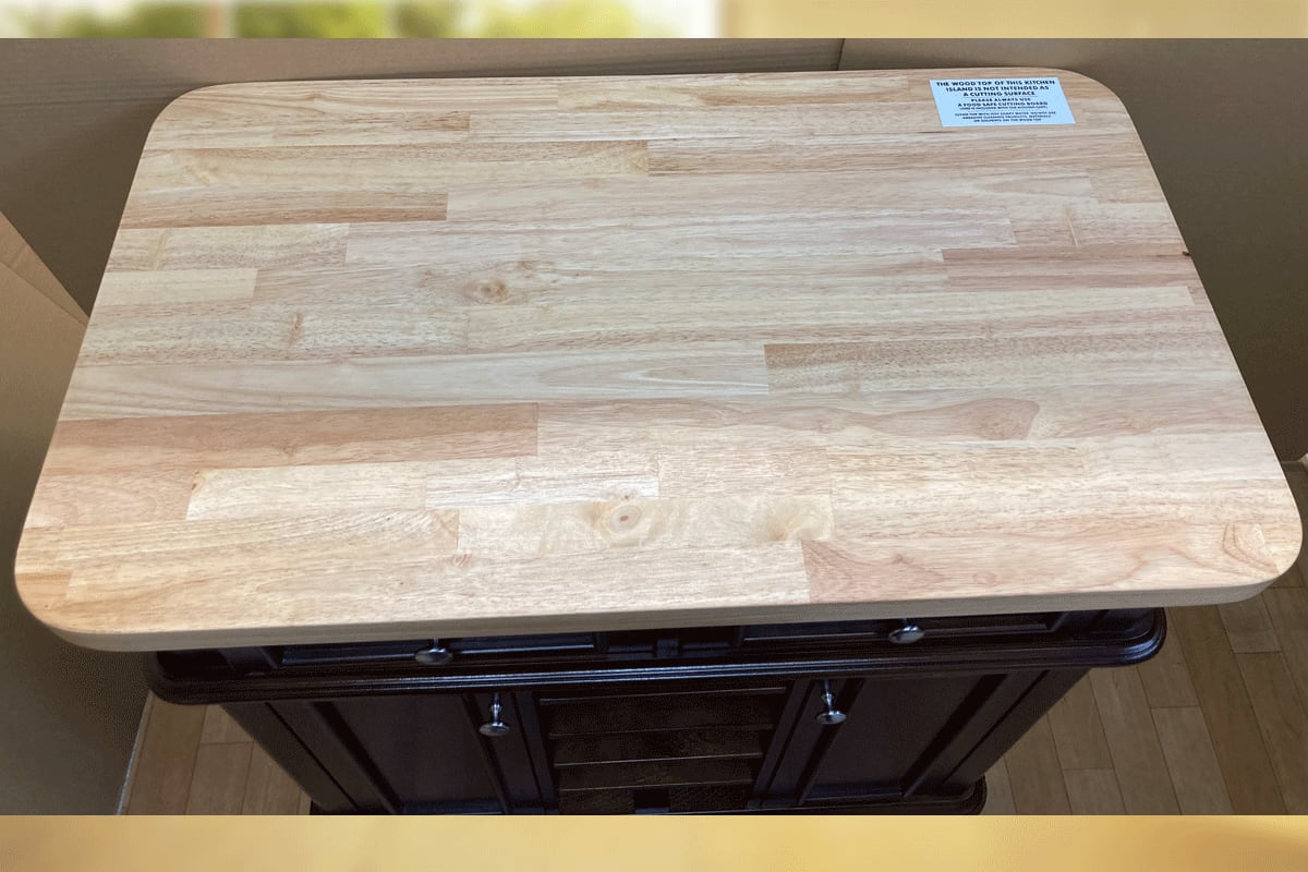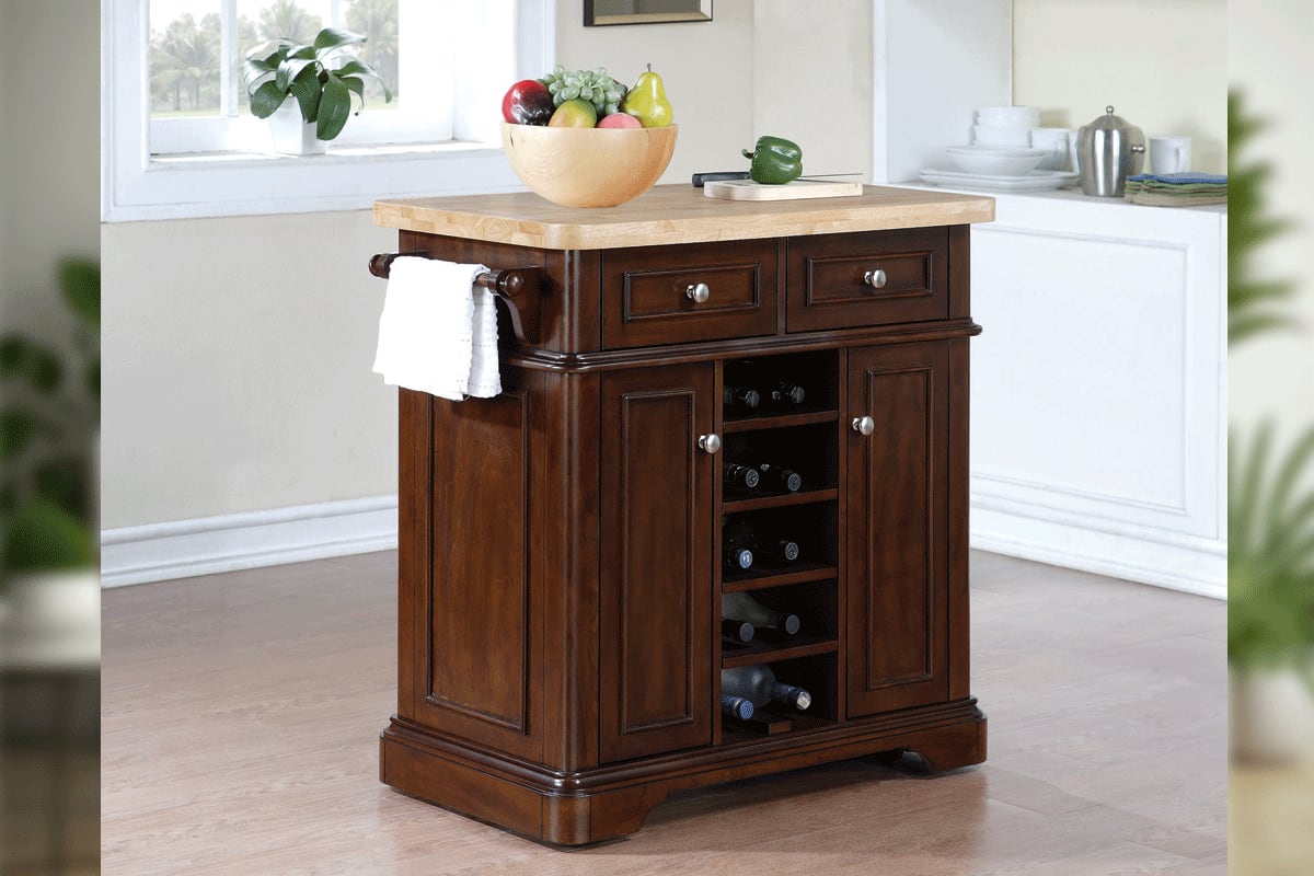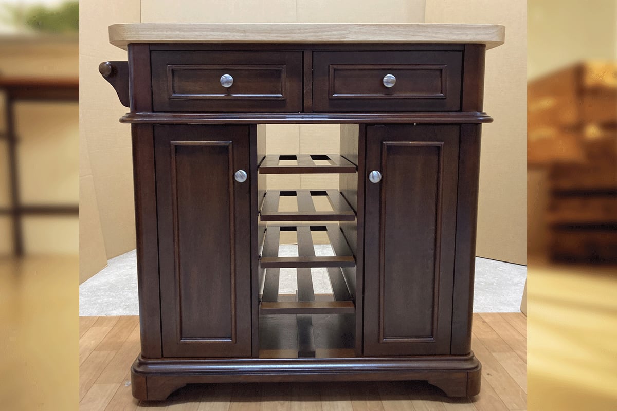 天然木の無垢天板と家具調キャビネットのキッチンアイランドです。キッチンで必要な様々なアイテムが収納できます。移動に便利なキャスター付きで中央にはオープンなボトルラックが配置してあります。カッティングボードやサイドにはタオルバーも付いています。2つの引き出しは、スライド式で両サイドからアクセス可能です。