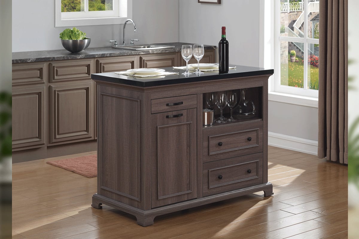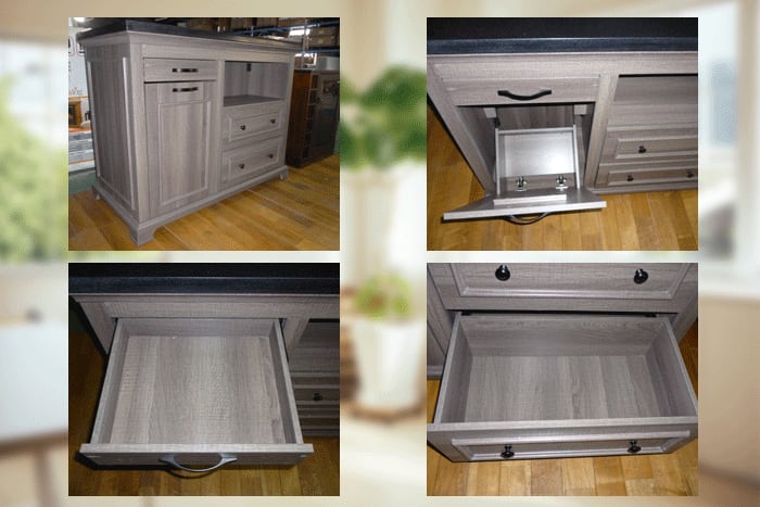 両面が収納に活用できるのが、最大の特徴です。前面には、3つの引き出しとオープン棚、手前に開く大きな収納があります。大きな収納にはゴミ箱が設置でき、オシャレなキッチンインテリアを演出します。背面にはフライパンやキッチンツールを吊るして収納が可能です。吊るし収納上部のオープン棚に調味料も収納できます。全体的に落ち着いた風合いの仕上がりとなっております。