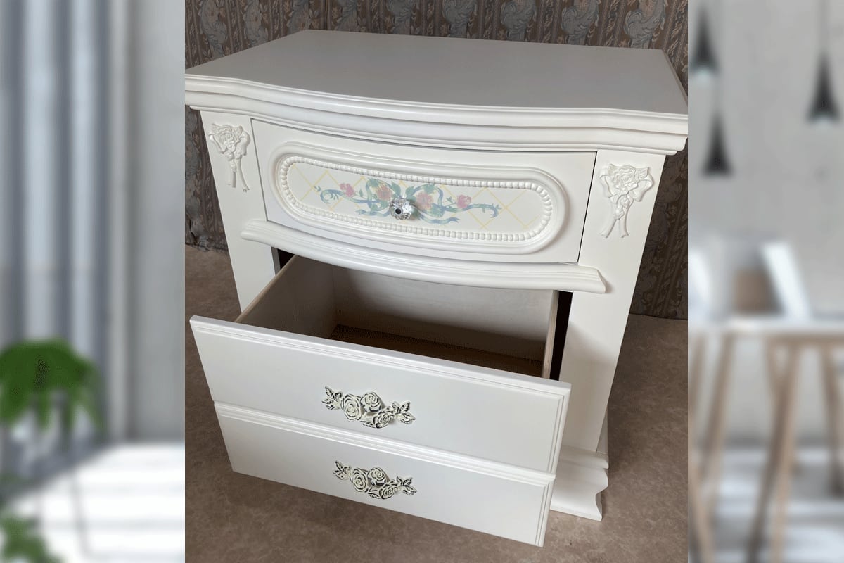 直輸入品のナイトスタンドです。ベッドサイドの小物入れや、電話台としてなどを様々なシーンでお使いいただけます。見た目は引き出しが3つあるようなデザインですが、引き出しは2つになります。取っ手は3つ付いております。